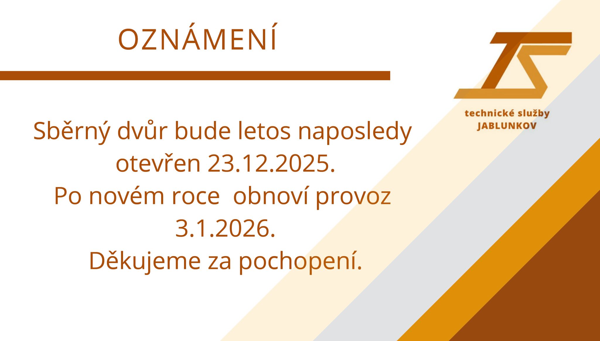 V letošním roce bude sběrný dvůr naposledy otevřený 23. 12. 2025 v novém roce bude otevřený od 3. 1. 2026.